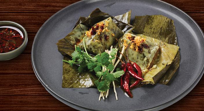 Steamed rice powder with spring onions and black fungus wrapped in banana leaf.