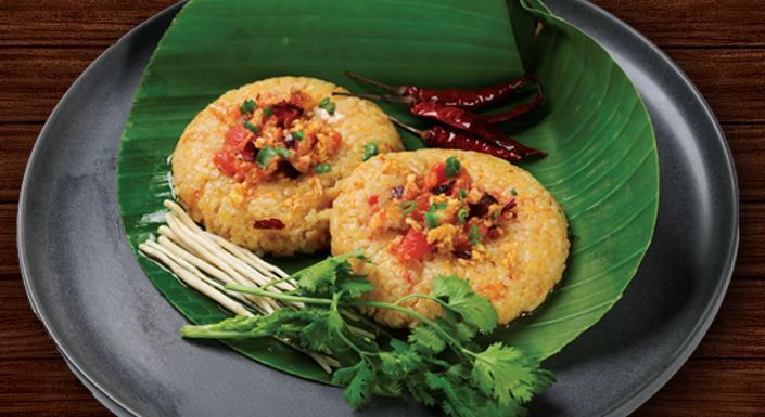 Fish & Rice Pattie, served with chives root, cilantro, and fried chili.*Popular dish of Shan State*