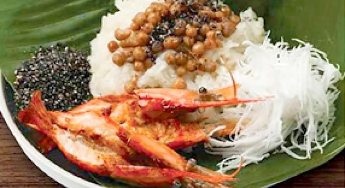 Sticky rice seasoned with sweet coconut milk and served with grilled freshwater prawn, shredded coconut, and pounded sesame seeds.