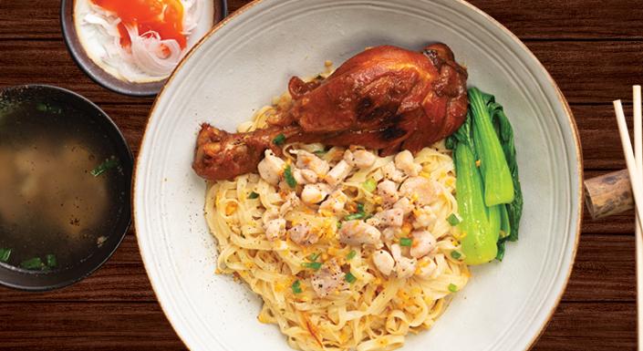 Noodle toasted with garlic-infused chicken oil, seasoning, and topped with aromatic shredded chicken, chicken stew, and clear soup.