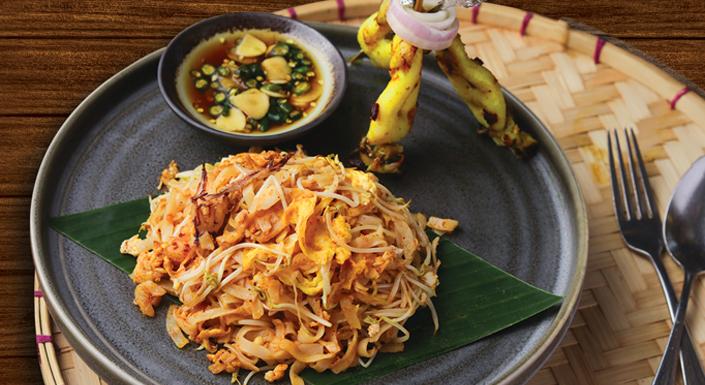 Southern Myanmar-style fried flat rice noodles with seafood and bean sprouts, served together with squid satay.
